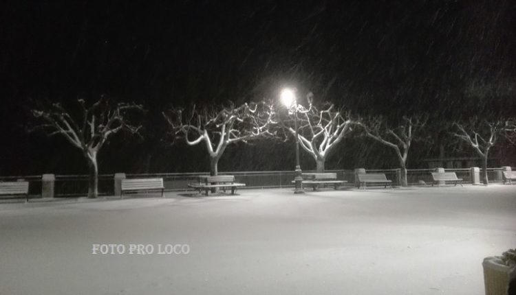 Al momento, ore 22,00, il manto nevoso ha raggiunto circa 10 centimetri. Sono entrati in azione i mezzi spargisale. Temperatura di zero gradi.
