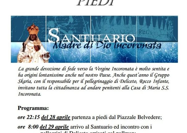 PELLEGRINAGGIO A PIEDI AL SANTUARIO M.SS. INCORONATA :: NOTIZIE prolocodeliceto.it:: Novità in PaeseIn Primo Piano By redazione On 23, Apr 2018 865 Share 865 Share FacebookTwitterGoogle+WhatsAppE-mailPrint