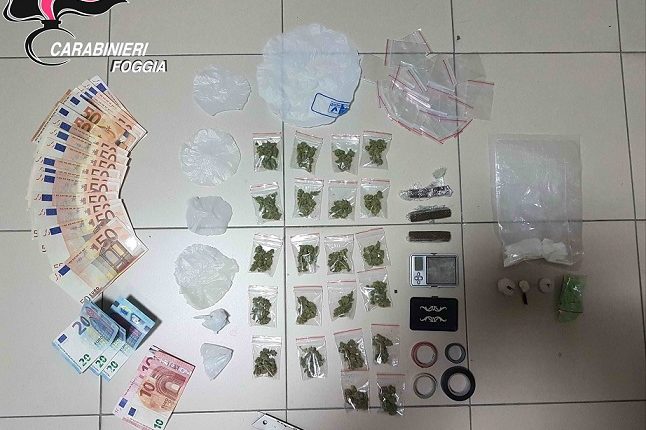 Era sera, e il giovane si stava allontanando a bordo di una Ford Fiesta dalla propria abitazione, in un complesso di case di edilizia popolare all’interno del noto quartiere “Torricelli”, lo stesso dove poche settimane fa i Carabinieri avevano scoperto un vero e proprio bunker, dotato di sistema di videosorveglianza e porta blindata, arrestando per spaccio due giovanissimi. Proprio in quel momento si trovava a passare una pattuglia della Stazione di Cerignola che, ben conoscendo le abitudini del giovane, gli ha intimato l’alt. Il ragazzo, invece di arrestare la marcia, si è invece allontanato, fermandosi solo dopo una curva, e dopo essersi disfatto di un sacchetto, nella speranza che i Carabinieri non lo avessero notato. I militari, però, che invece avevano seguito bene i movimenti del giovane, lo hanno recuperato rinvenendovi all’interno 64 grammi circa di cocaina, 38 di hashish e 30 di marijuana, oltre a quasi un migliaio di euro in contanti, presumibilmente ottenuti dallo spaccio degli stupefacenti.