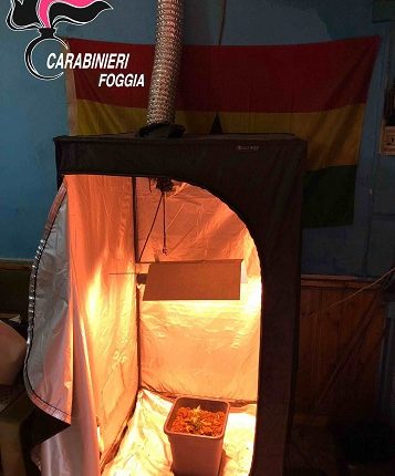 I militari, nel corso di un ampio servizio a largo raggio che ha visto impiegato anche personale delle Stazioni di San Giovanni Rotondo, San Marco in Lamis, dello Squadrone Eliportato Cacciatori di Sardegna e del 5° Reggimento a Cavallo, hanno eseguito a San Giovanni Rotondo numerose perquisizioni personali e domiciliari nei confronti di alcuni personaggi di spicco della criminalità locale. Nel corso di una di queste perquisizioni, presso l’abitazione dell’arrestato sono stati rinvenuti 45 grammi circa di hashish e una piantina di marijuana, oltre a tutto l’occorrente per la produzione ed il confezionamento in dosi dello stupefacente, consistente in un impianto domestico per la coltivazione della marijuana, costituito da una tenda di plastica, aerata attraverso un tubo di alluminio collegato alla canna fumaria della casa, un rilevatore di umidità e temperatura, una lampada alogena, un aspiratore a ventilazione e fertilizzanti, un bilancino di precisione, tre tritaerba, oltre alla somma contante di 160 euro. Nella stessa sono anche state trovate e sequestrate alcune armi bianche e strumenti da offesa, quali coltelli a serramanico, sfollagente, una katana ed una mazza da baseball.