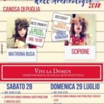 Inoltre, domenica 29, i ragazzi dell’IISS Garrone di Canosa di Puglia realizzeranno un inedito spettacolo di marionette, da loro ideate e creato, circa l’episodio narrato da Tito Livio nella sua opera“Ab Urbe Condita” in cui protagonista è una facoltosa donna canosina, la Matrona Busa, la quale accolse i soldati romani sfuggiti dall’eccidio durante la Battaglia di Canne il 4 Agosto del 216 a.C. Lo spettacolo coinvolgerà grandi e piccini e riporterà i partecipanti nell’antica Canusium.Il tutto avrà luogo avvolti da un magico gioco di luci che renderà ancor più affascinante l’atmosfera.