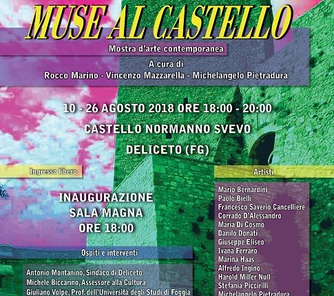 La rassegna d’arte contemporanea Muse al castello propone per il secondo anno consecutivo un percorso che si snoda dalla scultura alla pittura, dall’incisione alla fotografia, fino alla moda, alla performance e alle installazioni e si articola in una serie di sale dedicate alle diverse arti: si va dalla stanza della “moda” con gli abiti-scultura della stilista Carla Rinaldi e i vestiti della costumista Vize Ruffo in dialogo con la pittura dal senso fortemente grafico di Corrado D’Alessandro, il lirismo cromatico di Mario Bernardini, la forza evocativa e struggente di Concetta Russo e i luoghi rivisitati dalla fotografia di Alfredo Ingino; alla stanza della “poesia”, nella quale la gioiosità cromatica di Marina Haas, il moto perpetuo del colore realizzato da Michelangelo Pietradura, i guerrieri metallici di Eos Renzetti e la superficie specchiante di Ivana Ferrari dialogano con i bozzetti per le scenografie realizzate da Danilo Donati per i film di Fellini e Pasolini, con le mute figure steliformi scolpite da Sergio Rubini e con le opere di Sinuhe da Foggia. I volti delle “muse” di Stefania Piccirilli si rispecchiano nelle figure virili di Paolo Bielli e nelle grafiche dal tema mitologico di Francesco Saverio Cancelliere, sotto lo sguardo severo delle fotografie di Harold Miller Null e della nostalgica cromia di Giuseppe Eliseo. Il vernissage inizierà il 10 agosto alle 18 con la presentazione di un video documentario sulla villa di Faragola realizzato dal documentarista Antonio Fortarezza e con una conversazione archeologica con il Prof. Giuliano Volpe, Professore presso l’Università degli Studi di Foggia inerente al documentario e alla valorizzazione dei beni storico-artistici del nostro territorio. La mostra sarà visitabile dal 10 al 26 agosto 2016 dalle 18 alle 20.
