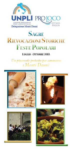 Come per lo scorso anno, ancora una volta lo sforzo di mettere insieme date e iniziative che allieteranno le varie comunità dei Monti Dauni viene dall’Unpli Puglia – delegazione dei Monti Dauni.