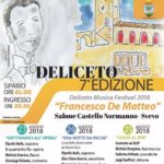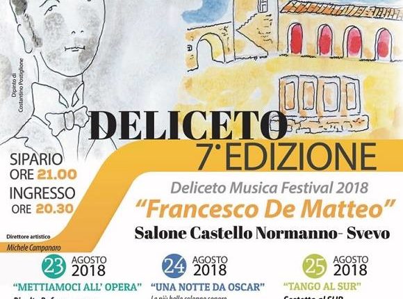 Dal 23 al 25 agosto 2018 nel salone del Castello Normanno Svevo di Deliceto avrà luogo la 7° edizione del “Deliceto Musica Festival Francesco De Matteo”. L’evento organizzato dall’Associazione Pro Loco “A. Iossa” di Deliceto con il patrocinio del Comune di Deliceto è oramai l’appuntam…ento di punta per gli appassionati di musica lirica e sinfonica dei Monti della Daunia e non solo. Una manifestazione per far conoscere la figura e le opere del giovane musicista, morto all’età di 22 anni, dopo aver musicato diverse opere liriche, come: “Dramma Eterno”, “Jeannette”, “Marco”, “Spasimo”,