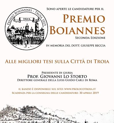 Troia, per celebrare i Mille Anni della città ecco la seconda edizione del premio “Boioannes”. A presiedere la giuria sarà Giovanni Lo Storto, direttore generale della LUISS di Roma Il premio per le migliori tesi sulla Città di Troia è intitolato al Catapano Boioannes, fondatore della città, ed è dedicato alla memoria del dott. Giuseppe Beccia. Da oggi aperte le candidature: on line il bando sul sito della Pro Loco TROIA – L’idea è nata alla fine 2016 per celebrare i Mille anni della Città di Troia nell’ormai prossimo 2019. Si chiama Premio “Boioannes” ed è nato dalla collaborazione tra Skantinato 58 Bibliocafè, Edizioni del Rosone, A.c.t! Monti Dauni – Associazione Culturale e Turistica e Pro Loco di Troia, che insieme hanno deciso di premiare gli autori delle migliori tesi sulla Città di Troia. La prima edizione è stata vinta dall’archeologo Alessandro Melilli con una tesi di dottorato sull’antica città di Aecae, pre-esistente alla medievale città di Troia, pubblicata poi con il titolo “Aecae, storia di un territorio” (Edizioni del Rosone). Il premio “Boioannes” prende il nome dal Catapano bizantino d’Italia Basilio Boioannes, personaggio storico che ebbe il merito di fondare la Città di Troia nel 1019, ed è dedicato alla memoria del dott. Giuseppe Beccia, medico condotto, bibliofilo, ispettore onorario della Soprintendenza ai beni culturali e appassionato divulgatore di storia patria, scomparso nel 1998. Anche la seconda edizione, come la prima, sarà aperta a tutte le tesi accademiche che portino contributi originali e qualificati alla conoscenza della Città di Troia, intesa nei suoi aspetti territoriali, naturalistici, storici, sociali, economici, artistici e culturali e che siano state discusse tra il 1 Gennaio 2015 e il 30 Aprile 2019. Il premio consiste in un contributo di 1000 € a cui si aggiunge la pubblicazione della tesi da parte delle Edizioni del Rosone. Il bando per partecipare al premio è ora on line all’indirizzo www.prolocotroia.it. Presidente onorario di giuria di questa seconda edizione sarà Giovanni Lo Storto, direttore generale della LUISS Guido Carli di Roma. Novità anche rispetto ai componenti della giuria che quest’anno si arricchisce della presenza di Giorgio Mercuri, presidente nazionale di FedAgri-Confcooperative in rappresentanza del mondo della imprese. Il suo autorevole contributo si unirà a quelli di Geppe Inserra, Mina De Santis, Antonio V. Gelormini, Umberto Berardi, Anna Martino e Edoardo Beccia, già componenti della giuria. Abbiamo pensato che questo premio fosse il modo più bello per celebrare il millennio della Città di Troia: sollecitare i giovani, gli studenti, a guardare al passato, al presente e al futuro della propria città.