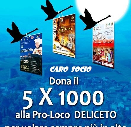 DONA ALLA PRO LOCO IL TUO 5 X 1000- GRAZIE :: NOTIZIE prolocodeliceto.it:: Novità in Paese::Vita Associativa By redazione Last updated 13, Lug 2019 1.554 Share 1.554 Share FacebookTwitterGoogle+WhatsAppE-mailPrint