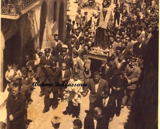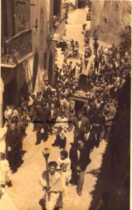 La foto processionale è risalente all’anno 1955, si nota l’inizio della salita di Via S. Antonio, o come un tempo chiamata r’ la selc’. La strada era costituita da selciato ai lati, mentre al centro vi erano dei mattoni cotti messi a mo’ di spigatum.