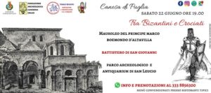 Sabato 22 Giugno, a Canosa di Puglia(BT), scoprirete gli affascinanti misteri del Principe d’Antiochia ed i suoi legami con la città ed in particolare con il Santo Sabino, partecipando alla passeggiata archeologica. Alle ore 19.00, avrà luogo il tour “Canosa Tardo Antica e Medievale-sul cammino del Principe Marco Boemondo d’Altavilla”, organizzato dalla Fondazione Archeologica Canosina e dalla Tango Renato-servizi per l’archeologia e il turismo, e rientrante nel calendario eventi dell’”Estate Canosina 2019”del Comune di Canosa di Puglia.