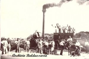 Finita la mietitura, cominciava l’attesa della Trebbia, finché a un certo punto cominciava a circolare la voce che la trebbia, tempo qualche giorno e sarebbe arrivata. La trebbia la si vedeva arrivare, per sconnessi tratturi, verso l’aia, mezzo traballante, tirata da un trattore Landini, e, siccome era stretta e alta, dava l’impressione che da un momento all’altro dovesse rovesciarsi su un lato. Intanto c’era tutta una folla che faceva ala ai lati, composta da quelli che sostenevano la trebbia, a volte dovevano intervenire nel dare una spinta di rinforzo al trattore. I proprietari, erano in ansiosa attesa, così le donne, e i bambini. Insomma era come se ci si preparasse a una festa. La mattina dopo non s’era ancora fatto chiaro, che già si attaccava la bombola del gas al Landini, il quale dopo un poco lanciava dei colpi così laceranti nell’aria calma, con relativa nuvola nera di scarico. Intanto la trebbia aveva preso il suo ritmo e era tutto un girare di cinghie e pulegge, di nastri e cilindri, mentre il rullo sollevatore ingoiava i fasci di grano che venivano buttati coi forconi. Si cominciavano a riempire i primi sacchi di grano e il proprietario, portava i sacchi nel magazzino. A noi ragazzi piaceva dormire (si faceva la controra) in mezzo ai sacchi. Durante i giorni della trebbiatura c’era un via vai di gente che sembrava una festa. Le donne preparavano le orecchiette o si aveva provveduto a comprare (li maccarun accattet’) da condire con il sugo (lu raù) di pollo ruspante e si spillava (lu vin crur’) vino rosso amabile, nel frattempo si aveva provveduto a (trumpè) fare del pane abbondante e fresco, per i lavoratori della trebbia, in modo che avessero un occhio di riguardo, nella gestione del lavoro. Chi cantava, anche se in mezzo al rumore della trebbia e del “motore”, chi si aiutava con la mimica per far capire che aveva bisogno di nuova “linfa”. Poi c’era quello con gli occhiali da motociclista e fazzoletto rosso a pois sul naso e al collo, sotto il tubo di scarico della paglia, alzava la “meta”, cioè il covone di paglia. Più in là le galline e il maiale, sotto il gelso, ne mangiavano i frutti e, erano così imbrattati del colore rosso che fuoriusciva dai gelsi, che erano sporchi come maiali. Oggi, a raccontarli, questi fatti, sembra che siano passati dei secoli, talmente le condizioni di vita e di lavoro sono cambiate, mentre invece tutto avveniva appena pochi decenni fa.
