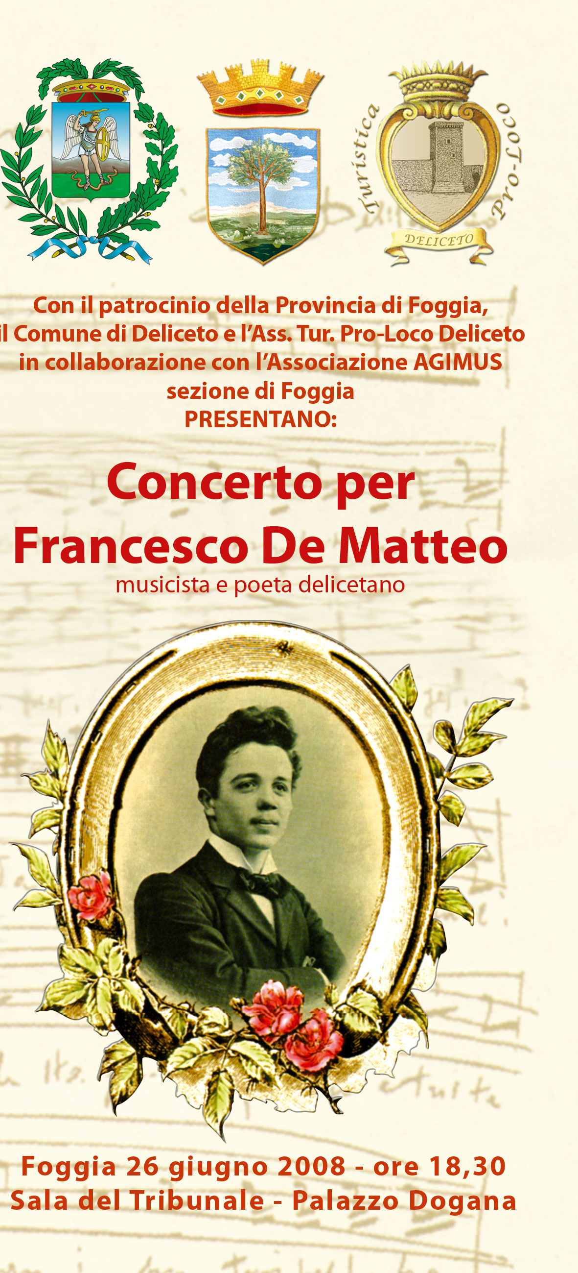 Continua il lavoro di riscoperta e di rivalutazione degli artisti delicetani che, con le loro capacità e i loro successi, hanno dato lustro a Deliceto portando alto il nome del proprio paese, portato avanti in primis dal Comune di Deliceto e dall’Associazione Turistica Pro-Loco Deliceto. Infatti, dopo i sontuosi festeggiamenti del 7 maggio scorso per il “Primo Centenario della nascita del Maestro Vincenzo Palermo”, a cui hanno partecipato numerose appassionati e curiosi provenienti da ogni parte d’Italia e del mondo, il Comune e l’Associazione Pro-Loco di Deliceto, con il patrocinio della Provincia di Foggia e la collaborazione dell’Associazione AGIMUS, Sezione di Foggia, presentano il: Concerto per Francesco De Matteo.L’importante evento, che avrà luogo il 26 giugno prossimo alle ore 18.30, presso