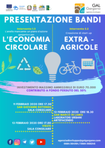 - l’intervento 1.3 “L’anello mancante: un piano d’azione garganico per l’economia circolare” che favorisce le imprese extra-agricole che intendono realizzare investimenti finalizzati ad un uso efficiente delle risorse, rendendo le produzioni e i processi produttivi ecocompatibili e rispettosi dell’ambiente.