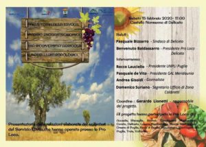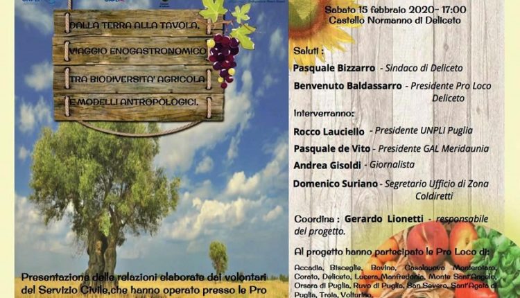 Sabato 15 febbraio 2020, alle ore 17,00 presso il Castello Normanno di Deliceto saranno presentate le relazioni elaborate dai giovani volontari del Servizio Civile che hanno operato nell’ambito del progetto “Dalla terra alla tavola, viaggio enogastronomico tra biodiversità agricola e modelli antropologici”.