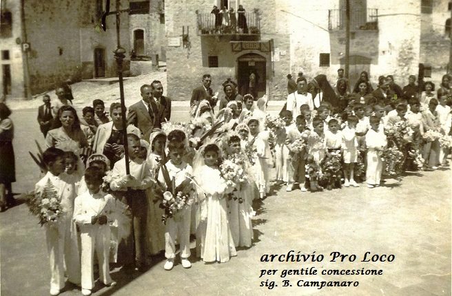 Noi, vi proponiamo due immagini, risalenti alle prime comunioni: del 10 giugno 1951 sul piazzale Belvedere e presso la scuola rurale Catenaccio del 1964. In quest’ultima, è da notare la presenza delle autorità scolastiche; religiose; civili e militari.