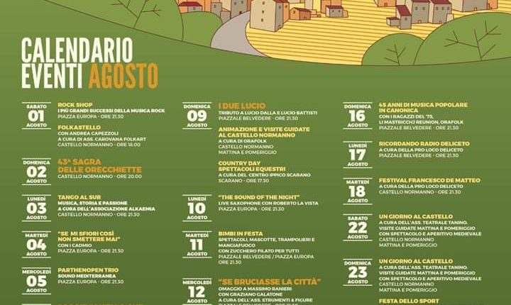PROGRAMMA ESTATE 2020 :: NOTIZIE prolocodeliceto.it:: Novità in Paeseeventi By redazione Last updated 7, Ago 2020 1.874 Share 1.874 Share FacebookTwitterGoogle+WhatsAppE-mailPrint