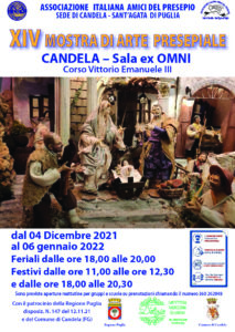 L’Associazione Italiana Amici del Presepe – Sede di Candela/Sant’Agata di Puglia, ha ripreso la sua attività, dopo il periodo buio della pandemia, allestendo in occasione del Natale la XIV mostra di arte presepiale, con il patrocinio della Regione Puglia e del Comune di Candela. Il visitatore apprezzerà la creatività e la lavorazione di materiali semplici delle opere esposte. Quest’anno sono esposti dei presepi con personaggi che rappresentano la quotidianità dell’ attuale momento pandemico. La mostra organizzata dal Presidente della sede AIAP Savino Freda e dai soci riproducono nei diorami scorci di Candela e di Sant’Agata di Puglia, le chiese e gli angoli paesaggistici più suggestivi dei Monti Dauni. .
