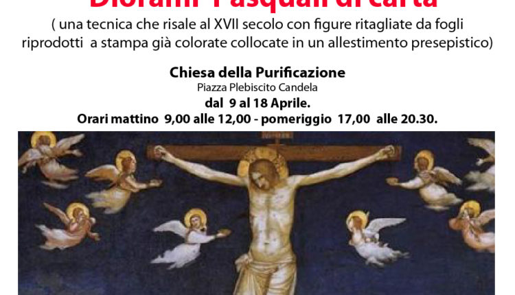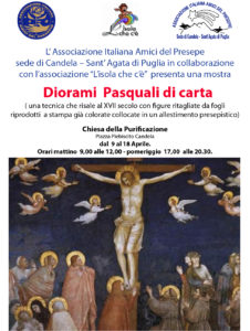 L’Associazione Italiana Amici del Presepe di Candela e Sant’Agata di Puglia in collaborazione con l’Associazione “L’isola che c’è“ espone in una mostra i presepi realizzati dai corsisti in un laboratorio di presepi di carta. Il corso è stato organizzato e diretto dal presidente Savino Freda della sede AIAP Candela Sant’Agata di Puglia facendo utilizzare materiali e tecniche presepistiche tipiche per la realizzazione di presepi di carta. La tradizione dei presepi di carta risale al Settecento, quando illustri pittori come Francesco Londonio o il palermitano Vito D’Anna ci lasciarono presepi che oggi ammiriamo nella Chiesa di S.Marco a Milano e nel museo diocesano di Caltanisetta. In un primo momento erano solo stampe da appendere ad una parete, poi si stamparono dei fogli da ritagliare, non colorati ed ognuno provvedeva alla colorazione. Negli anni 50 e 60 nacque un’ultima generazione di presepi di carta, quelli che, una volta aperti, si innalzavano verso l’alto diventando tridimensionali a 180°, visibili cioè davanti e dai lati. La successiva evoluzione fu quella dei presepi ammirabili sia davanti che dietro, da aprire come un libro. I presepi in carta ebbero grande successo, che raggiunse il culmine nel IX secolo. Ancora oggi sono molto utilizzati in Austria, Germania, Italia e Repubblica. Le rappresentazioni della passione e resurrezione di Cristo sono oggi abbastanza inusuali, godono di grande diffusione nelle zone del Sud Italia e fino alla metà del XVI sec. venivano regolarmente allestite mostre in tutta Europa.