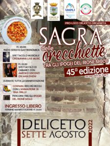 E’ con costante tenacia ed impegno, che, ormai da più di quattro decenni, la prima domenica di agosto, l’Associazione Turistica Pro Loco “A. Iossa”, organizza in collaborazione con il Comune di Deliceto la “Sagra delle Orecchiette e fusilli”.