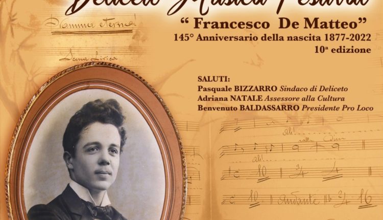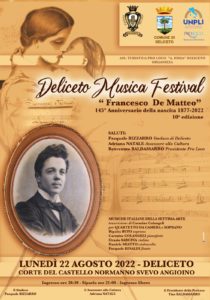 Ritorna il Deliceto Musica FESTIVAL “Francesco De MATTEO”. Lunedì 22 agosto, “Corte” del Castello Normanno di Deliceto. Un evento, giunto alla 10° edizione, organizzato dalla Pro Loco in collaborazione con l’Amministrazione Comunale di Deliceto.