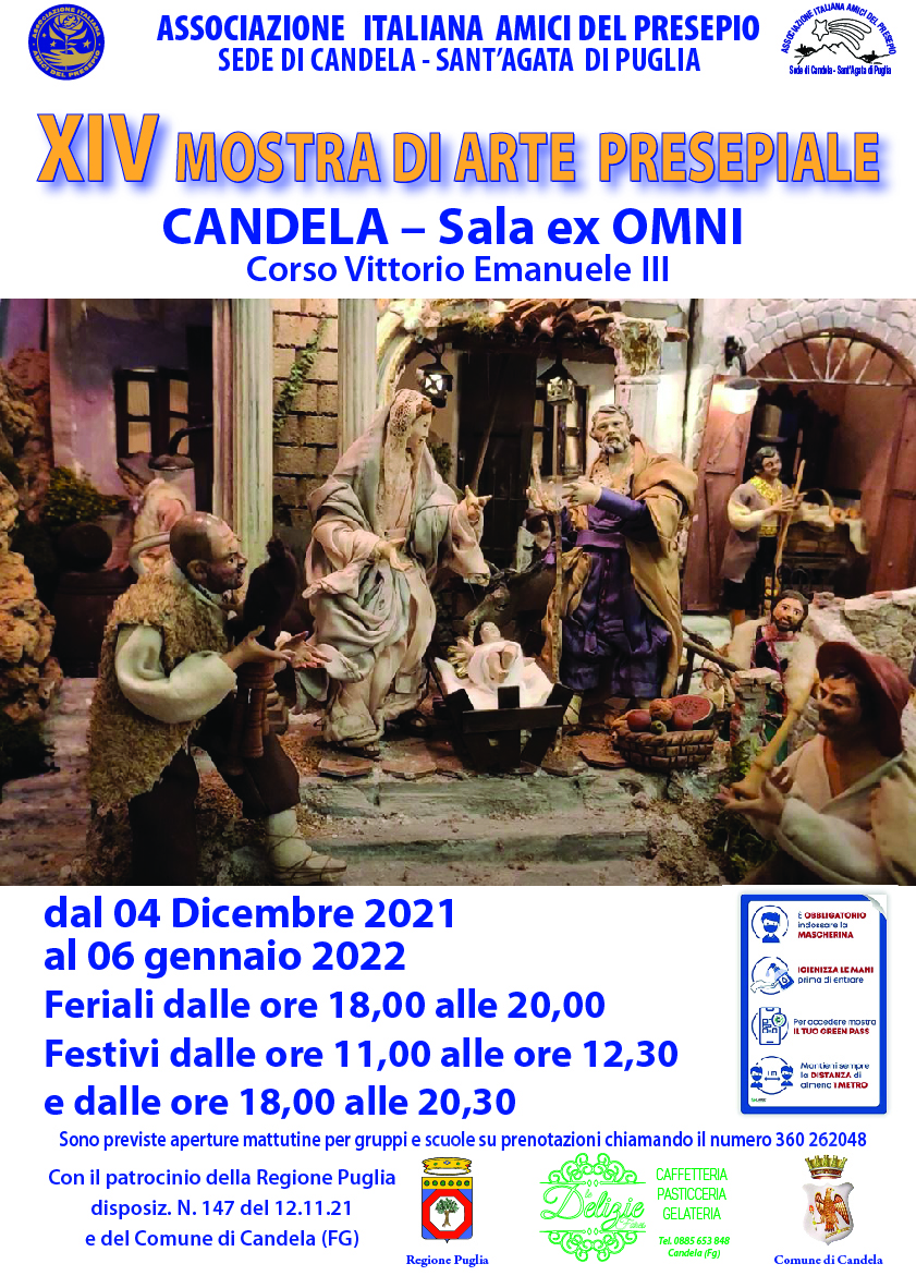 In occasione del Natale, anche quest’anno, ritorna l’arte del presepio con la XV mostra, allestita dall’Associazione Italiana Amici del Presepio sede di Candela – Sant’Agata di Puglia, con il patrocinio della Regione Puglia e del Comune di Candela, presso la sala “ Ex OMNI”, in Corso Vittorio Emanuele a Candela.