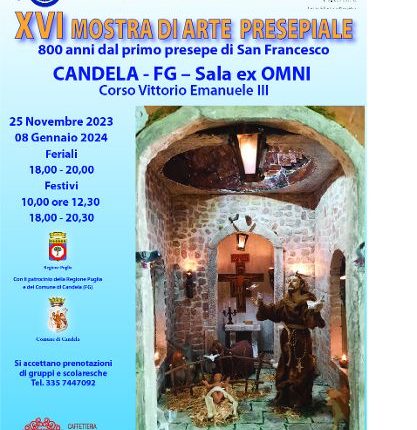 Sant’Agata di Puglia celebra, nella mostra di quest’anno, la storia del primo presepe al mondo, realizzato da San Francesco a Greccio, nel 1223. Considerata la ricorrenza speciale, per gli 800 anni da questo straordinario evento storico, culturale e spirituale, la mostra sarà appositamente dedicata al frate di Assisi. Le diverse rappresentazioni realizzate dal Presidente della sede Savino Freda celebrano, in diversi presepi, la figura del Santo, il quale ha trasmesso, in quella notte Santa, il culto del presepe. Saranno molte le opere esposte e, particolarmente suggestivo, è il presepe realizzato presso la Chiesa della “B.V.M. Purificazione” di Candela, dove è esposta l’opera denominata “Il presepe di Greccio 1223-2023”.